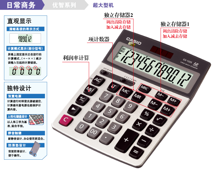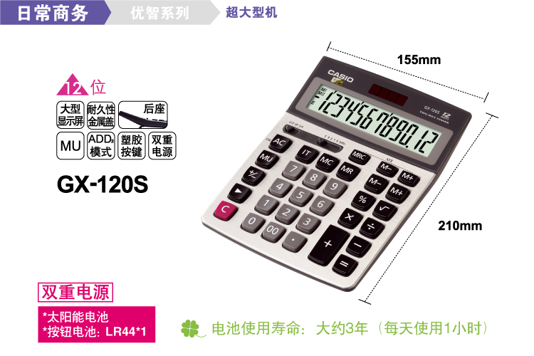 首页 > 办公文具 > 桌面用品 > 计算器 > 卡西欧(CASIO) 12位大型金属板计算器 商务办公计算器#GX-120S