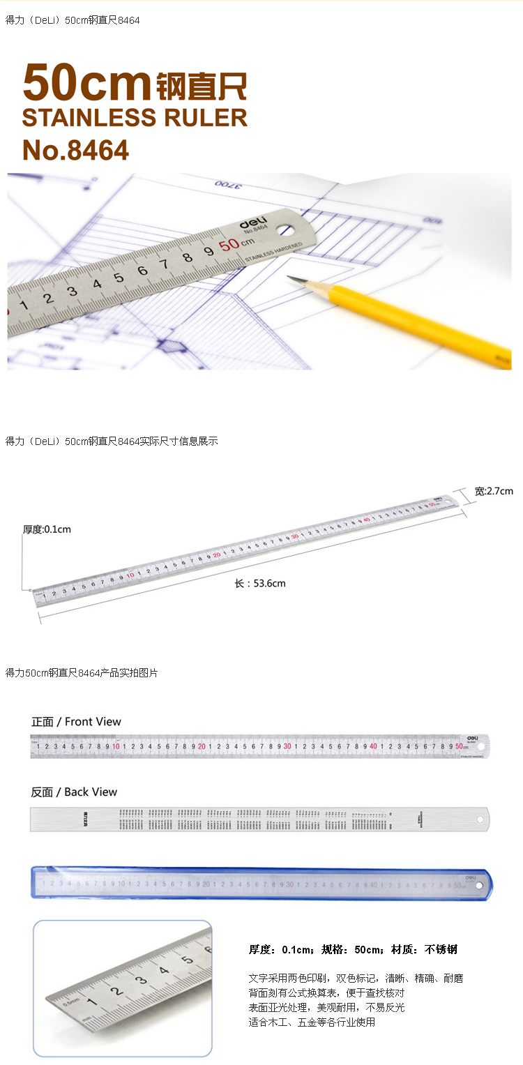 首页 > 办公文具 > 桌面用品 > 直尺/卷尺 > 得力(Deli) 50cm不锈钢直尺 刻度尺绘图钢制金属尺#8464
